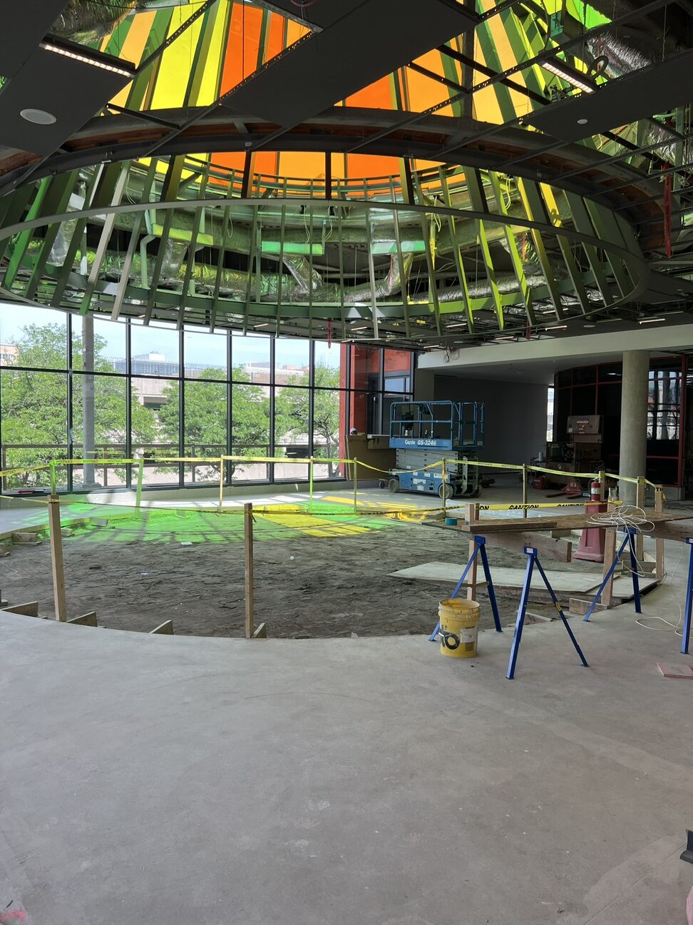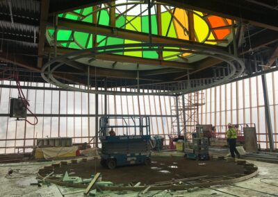 - There is a cone-shaped skylight that is 31 feet wide and 15 feet high serving as the project’s primary design feature, creating an iconic piece of architecture on the GRCC campus. This is the first time Granger has been involved in constructing one of these unique skylights, which features 20 colored glass panels which are 1-5/16” laminated glass with a colored film inner layer in seven shades of oranges, yellows, and greens. The glass is set in a painted aluminum frame that serves as the center portion of the ceiling for the new addition, creating a kaleidoscope of light that will illuminate the room while also serving as a beacon for the campus that will be highly visible along the downtown Grand Rapids skyline.