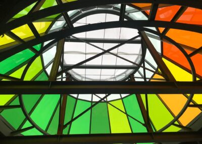- Between the room’s suspended acoustical tile ceiling and the skylight above, custom laser-cut plastic panels colored to match the skylight glass are supported by a custom-fabricated aluminum structure to improve room acoustics while also enhancing the experience of light and color in the room.
