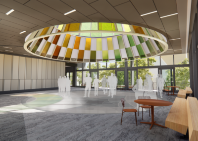 Grand Rapids Community College received a $5 million investment from the Peter Secchia family to construct a new piazza for the Secchia Institute for Culinary Education. The project involves transforming an existing outdoor patio at the Wisner-Bottrall Applied Technology Center into an enclosed multi-use space that incorporates a decorative oculus skylight that includes colorful glass panels.