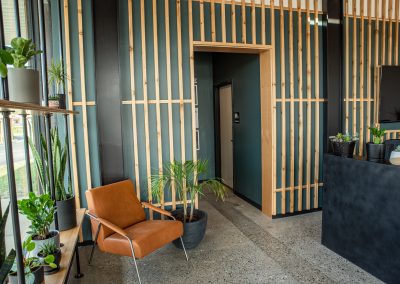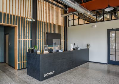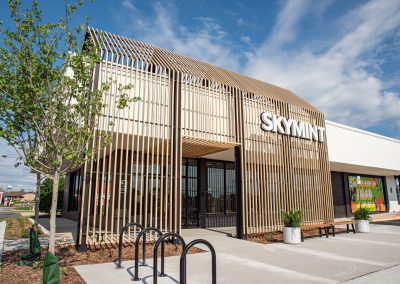 CD Barnes installed a cantilevered decorative steel structure at the front entry, highlighted with clear-coated White Northern Cedar purlins and battens. This element was field-painted to complement Skymint’s branding colors. It features LED landscape lights that provide lighting on the structure during the nighttime hours.