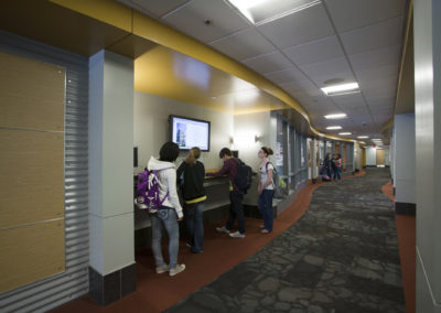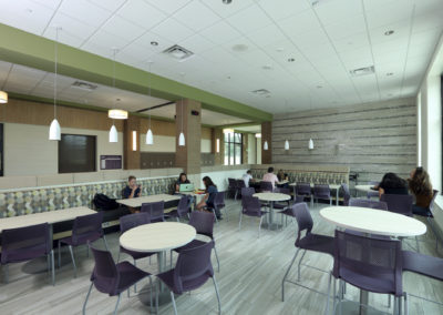 Cafeterias of the past were frequently only utilized at mealtimes, sitting vacant for much of the day. Now a centrally located cafeteria can function more like a commons space, serving as a dining space, overflow area for events, and a desirable destination for individual study. Proper furniture, lighting, and location all contribute to these spaces being used beyond meals. Both cafeterias and gymnasiums can serve as meeting spaces for large groups if they have the proper technology.