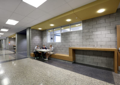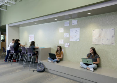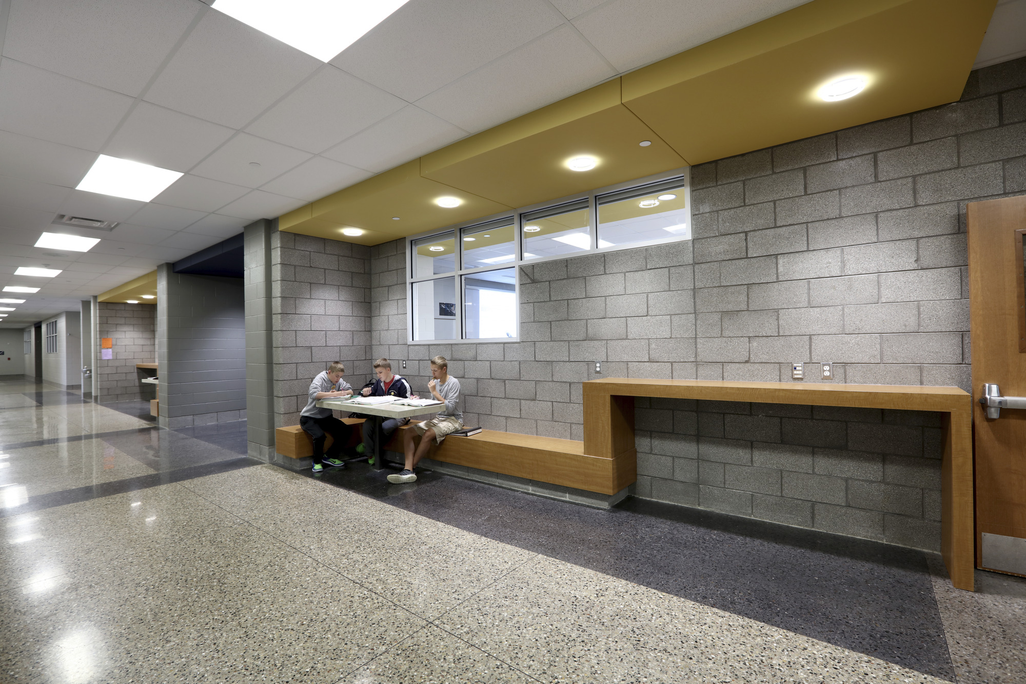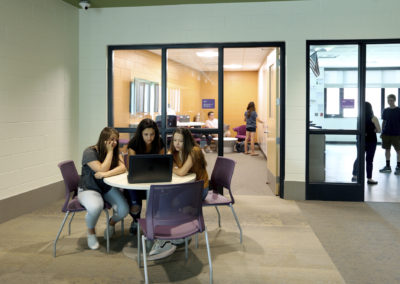 An emphasis on collaboration with others means that students need more room than a traditional classroom can sometimes provide. Extended learning areas and small group rooms adjacent to classrooms are dedicated spaces for a few individuals to do project work together. In older buildings lacking space for these larger areas, schools may remove display cases or even lockers in hallways to add a work surface where students can gather to collaborate. Regardless of their size, these flexible spaces all feature varied seating, writeable surfaces, and integrate technology.